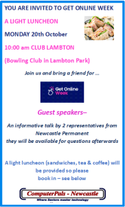 Monday 20/10/2025 – at Club Lambton starting 10:00 am with 2 representatives from Newcastle Permanent BS – topic scams, followed by lucky door prizes, then fun and games activities followed by a light luncheon (sandwiches, tea & coffee)